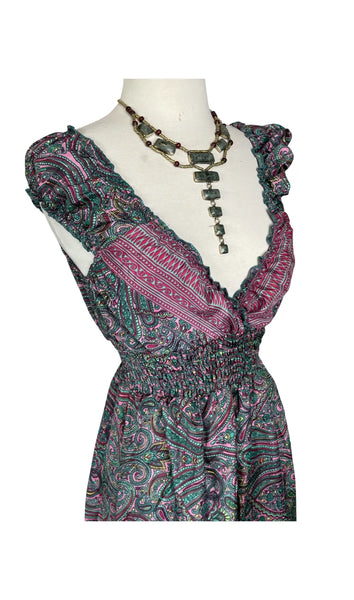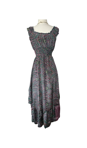 Bohemian high and low ruffle dress adjustable to fit from Small to X -Large. Fabric feels amazing! Silky, soft and wrinkle free. Stretchy waist and stretchy comfortable arm holes. Can be worn on or off the shoulders.