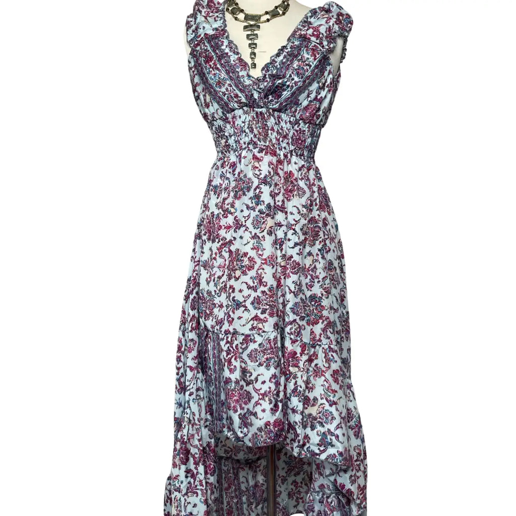 Bohemian high and low ruffle dress adjustable to fit from Small to X-Large. Fabric feels amazing! Silky, soft and wrinkle free. Stretchy waist and stretchy comfortable arm holes. Can be worn on or off the shoulders.